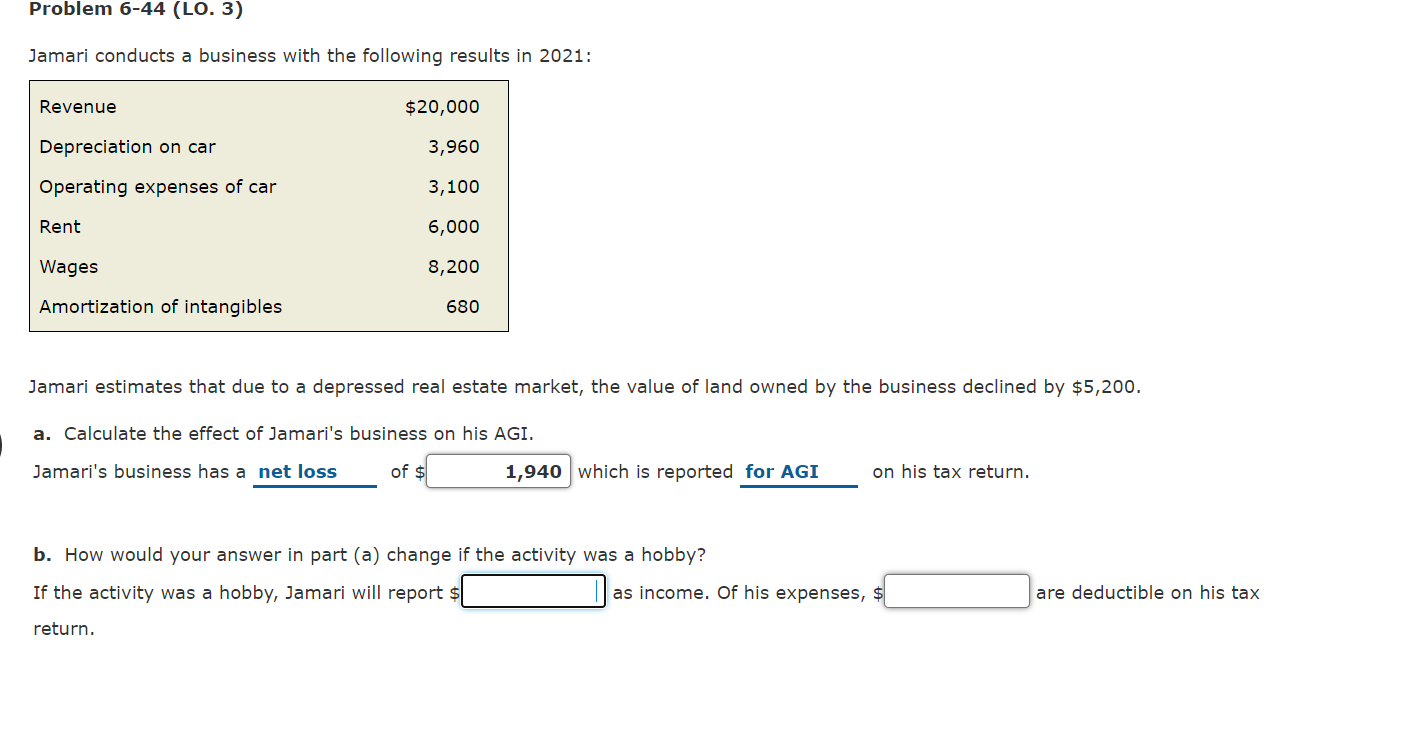 Revenue 20000 Depreciation on car 3960 Operating expenses of car 3100 Rent 6000 Wages 8200 Amortization of intangibles 680 Jamari estimates that due to a depressed real estate market the value of land owned by the business declined by 5200. Jamari Peters Social Security number 123-45-. 3 Jamari conducts a business with the following results in 2021. Jamari estimates that due to a depressed real estate market the value of land owned by the business declined by 5200.