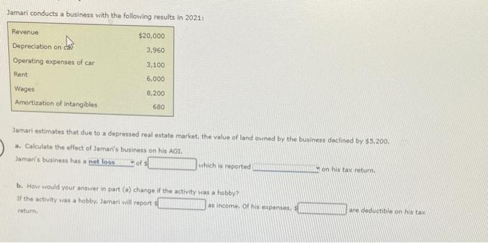 Revenue 20000 Depreciation on car 3960 Operating expenses of car 3100 Rent 6000 Wages 8200 Amortization of intangibles 680 Jamari estimates that due to a depressed real estate market the value of land owned by the business declined by 5200a. 3 Jamari conducts a business with the following results in 2019. Jamari conducts a business with the following results in 2018.